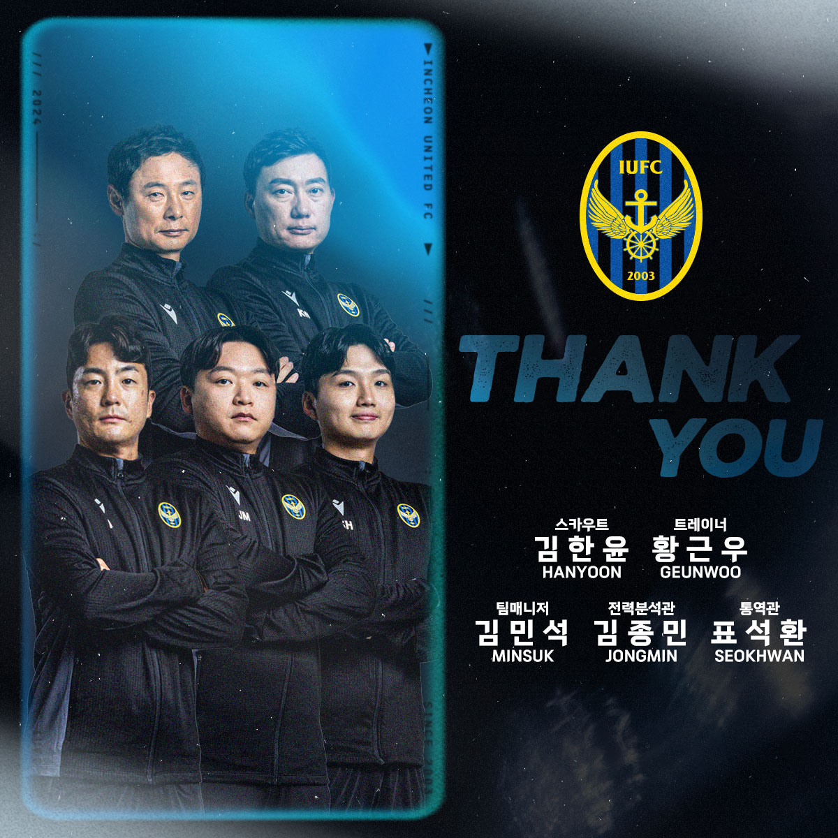 안녕하세요, 인천유나이티드입니다. 2024시즌을 끝으로 변재섭, 박용호, 김재성, 김광석, 김이섭, 오지우, 김한윤, 황근우, 김민석, 김종민, 표석환 이상 11명의 코칭스태프, 팀 스태프가 우리 구단과의 동행을 마무리하게 되어 안내 말씀을 드립니다.